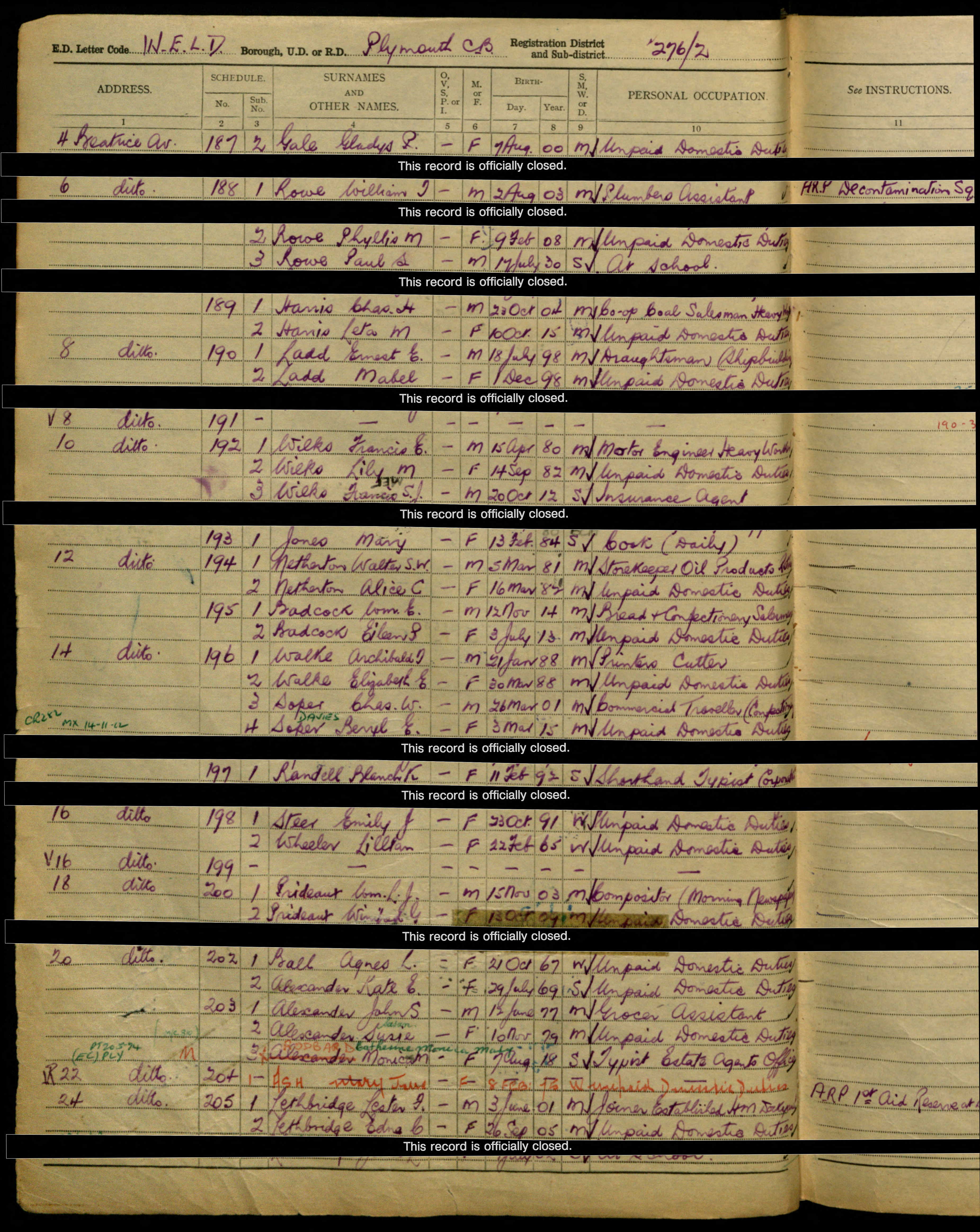 1939 Register: Blanche K. Randell: Plymouth; line 28, Schedle 197/1; ED WELD; Reg District: 276/2; Birth date 11 Feb 1892