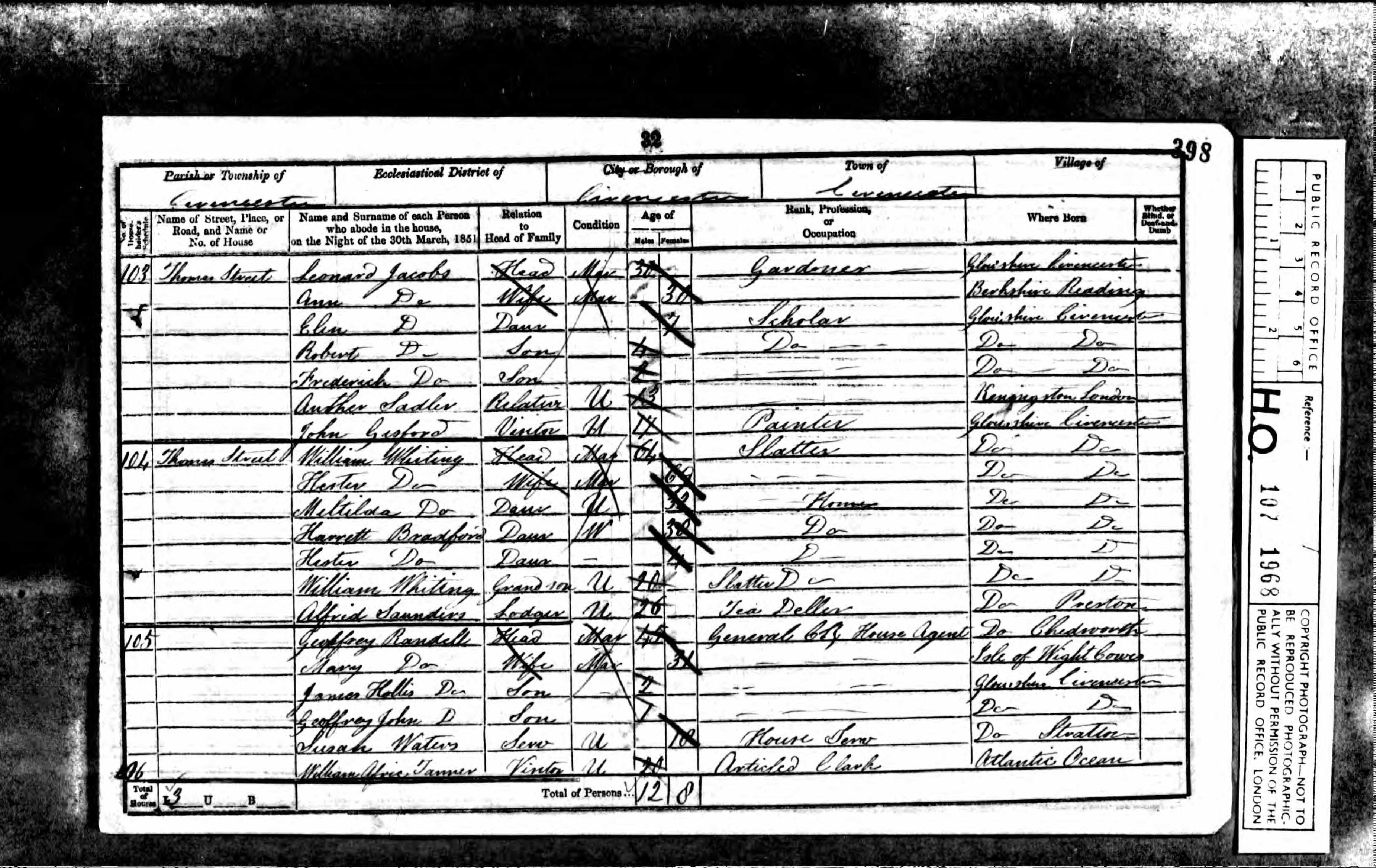 1851 Census - Geoffrey Randell (General House Agent), wife Mary, two sons, servant and visitor; Cirencester; Class: HO107; Piece: 1968; Folio: 398; Page: 32; GSU roll: 87368