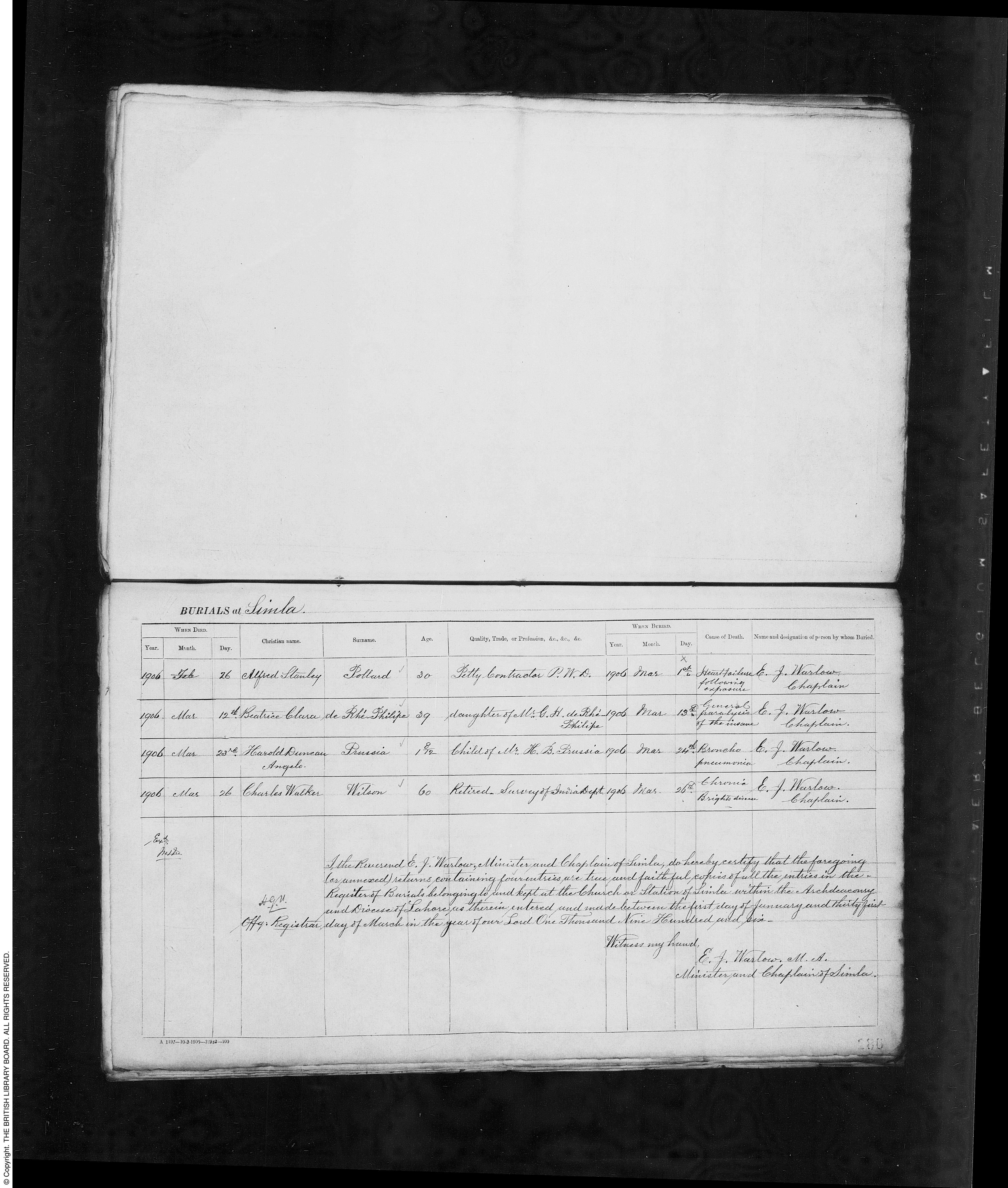 Death and burial of Harold Duncan Angelo Prussia; Burial 24 Mar 1906, Simla; Archive N-1-331 Page 286