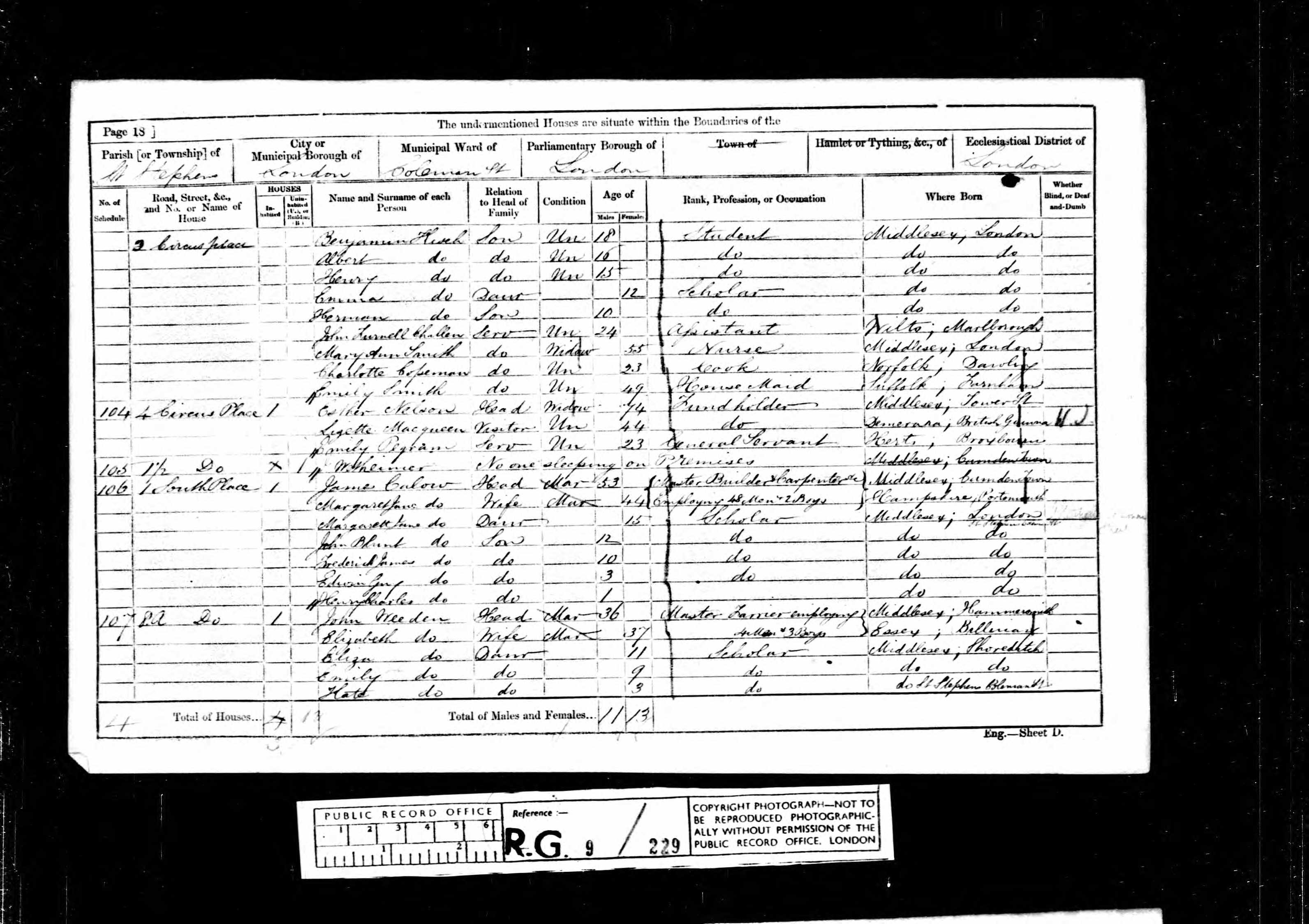 1861 Census - Emily Pegram; St Stephen Parish, London City North East; ED 14, Household Schedule 104