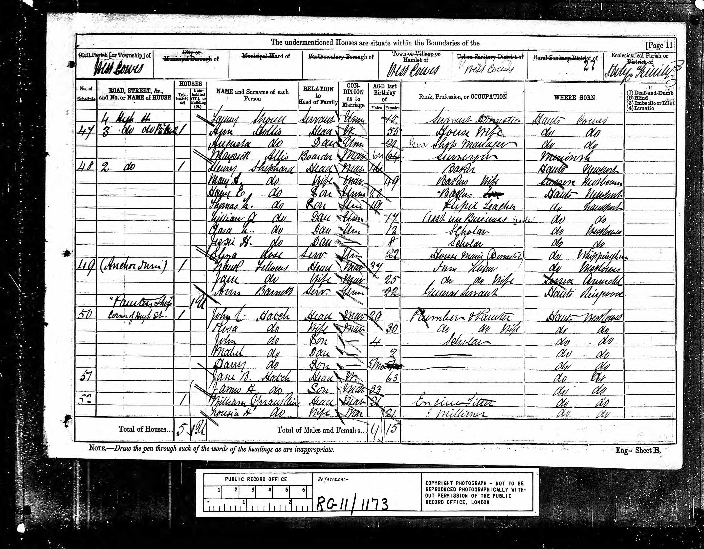 - 1881 Census - Jane B Hollis (widow) with son James Hollis; shared with son John and family