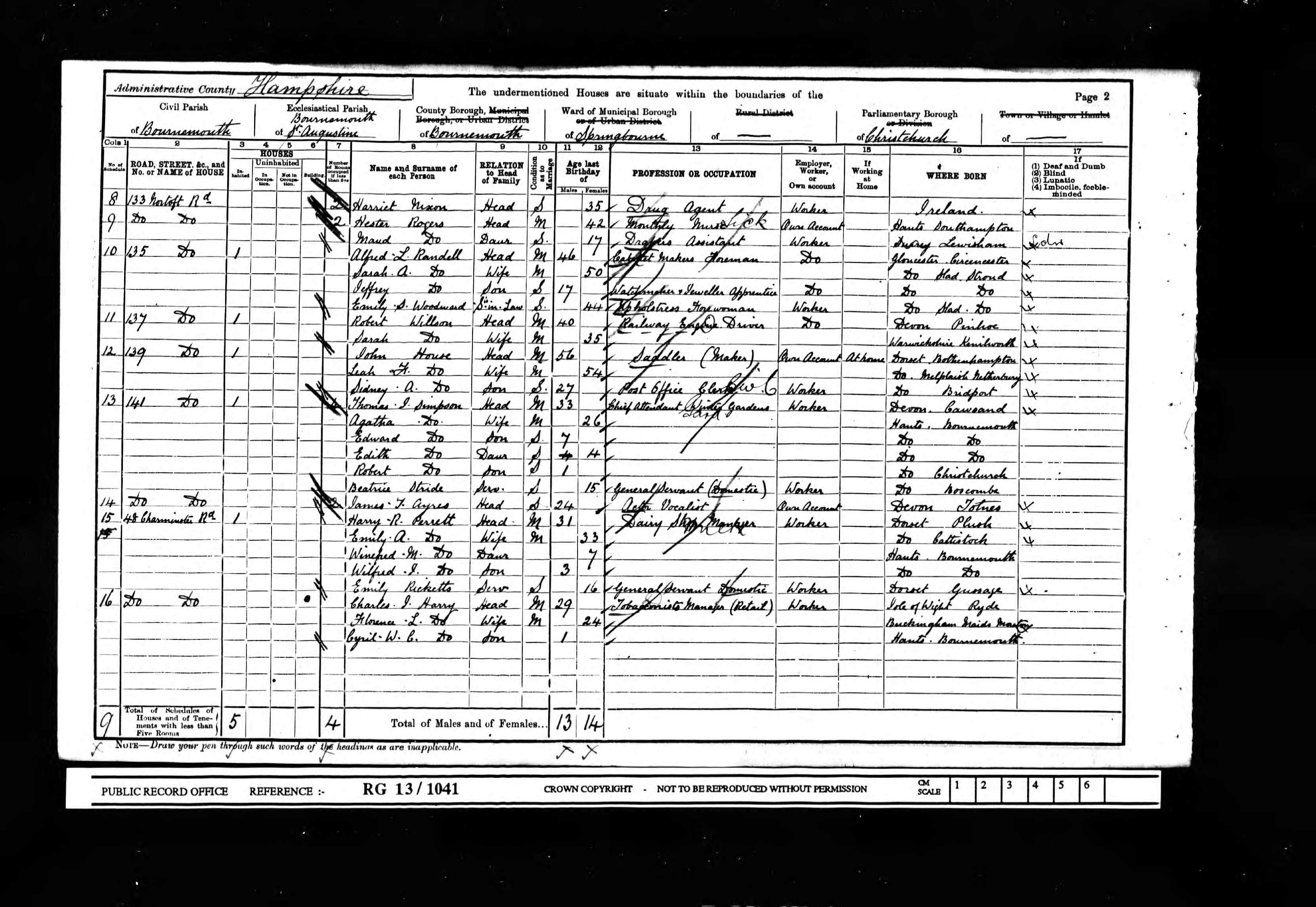 1901 Census: Alfred Luke Randell (Cabinet maker, foreman) with wife Sarah Ann, and son Jeffrey: Bournemouth: Class: RG13; Piece: 1041; Folio: 86; Page: 2