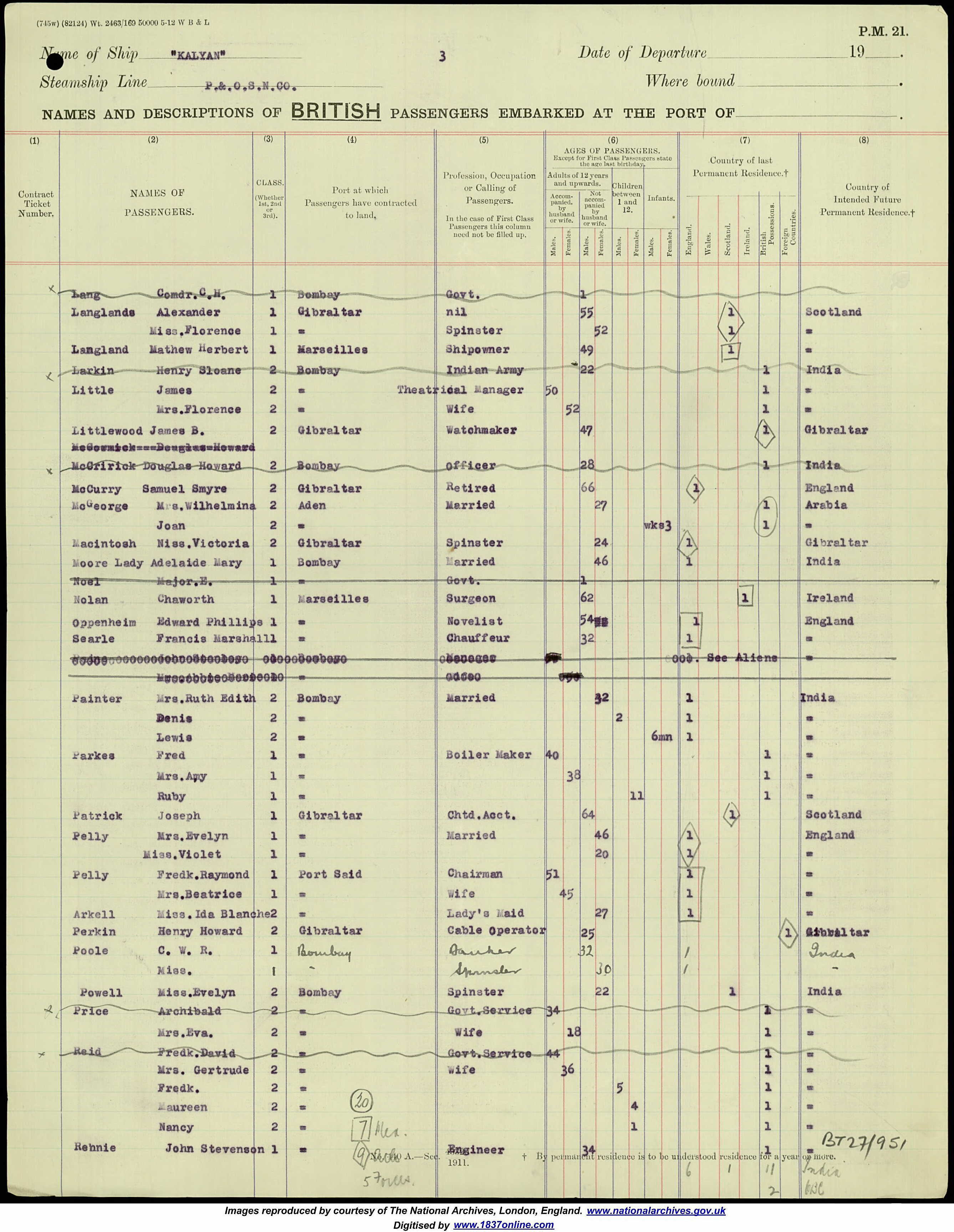 Douglas H G McCririck travelled from London on the SS Kalyan of the P & O S.N. Co.
