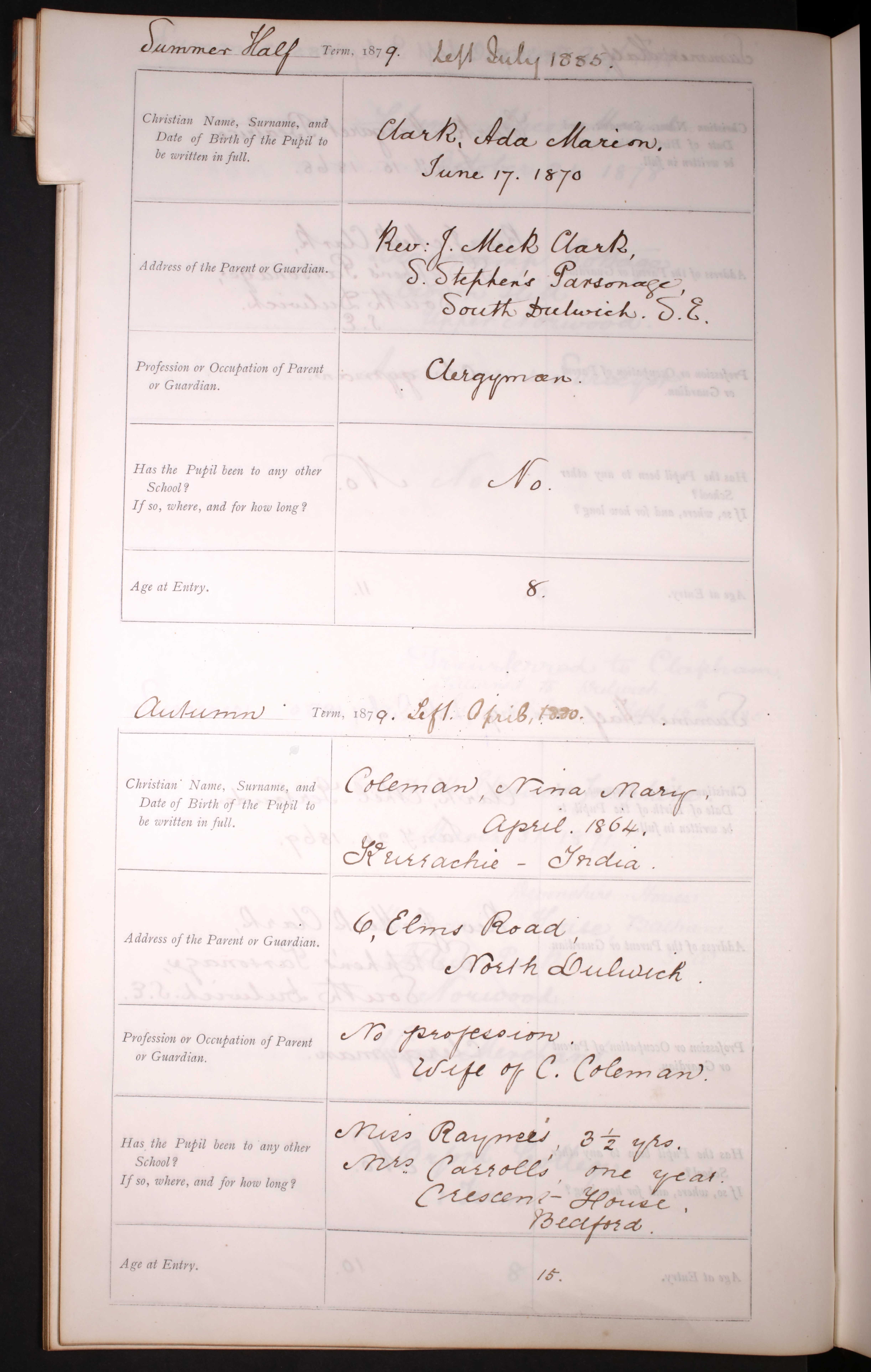 Nina Mary Coleman, Dulwich High School, date of admission 1879, aged 15. Date of birth April 1864; Reference: GDS/13/7/1