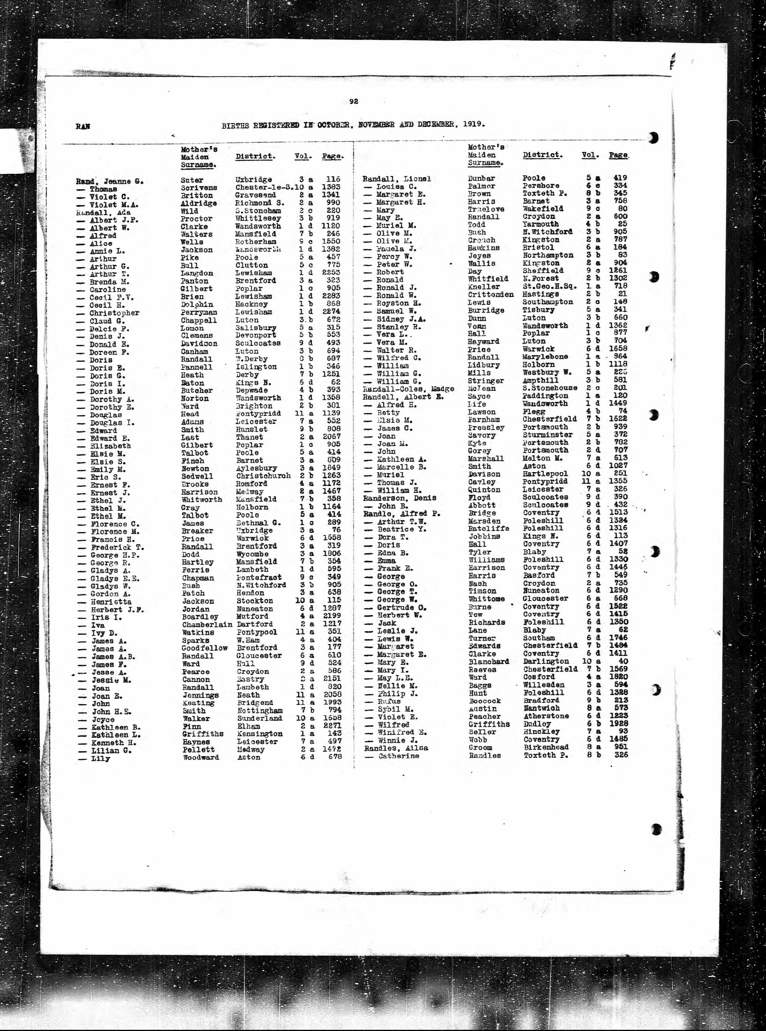 Birth of Alfred Hollis Randell; Wandsworth; Volume 1d, Page 1449; Mother's maiden name Life