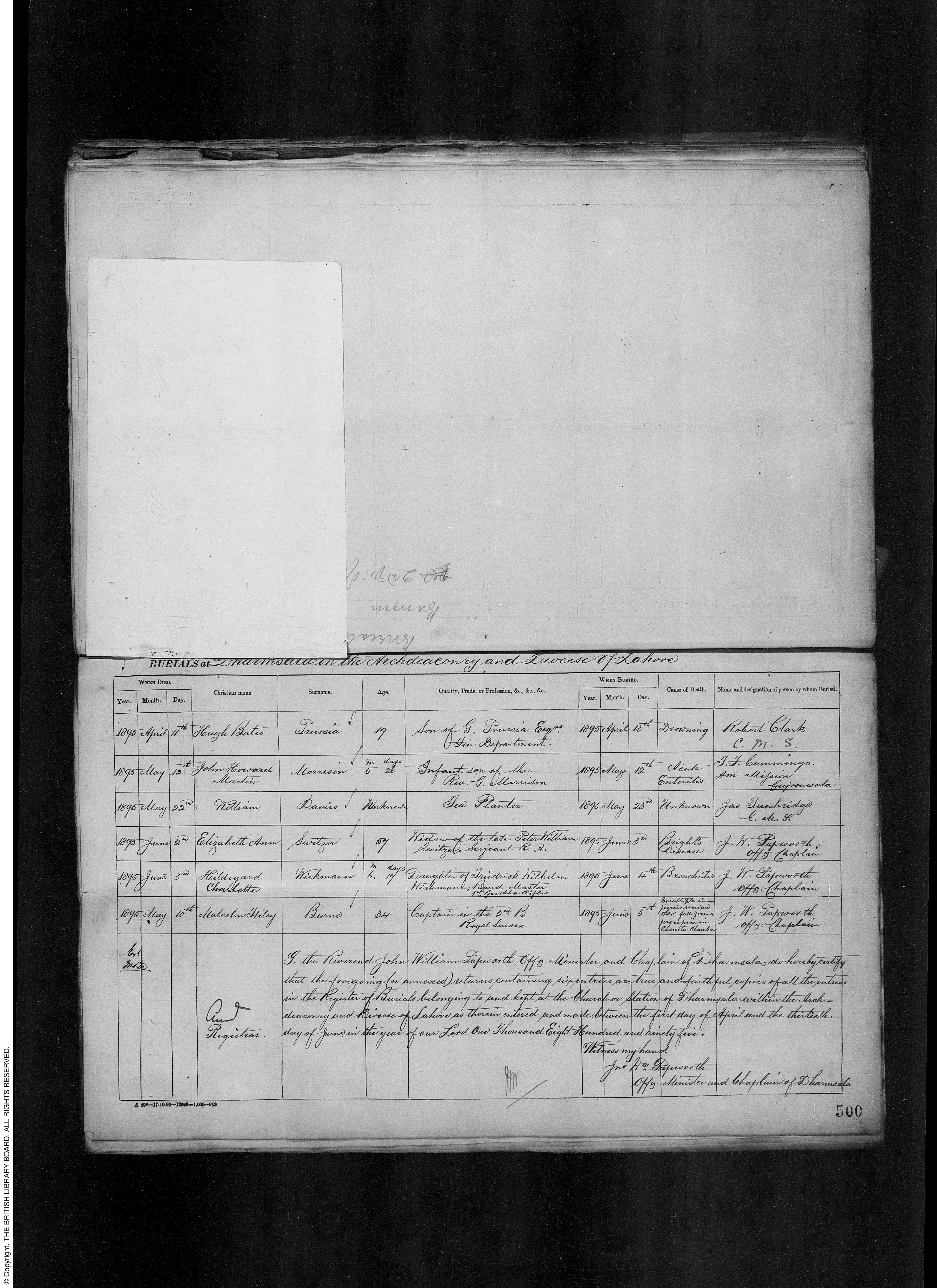 1. Death and burial of Hugh Bates Prussia; Birth 1876 Age 19; Burial 13 Apr 1895 Dharmsala; Archive N-1-246 Page 500