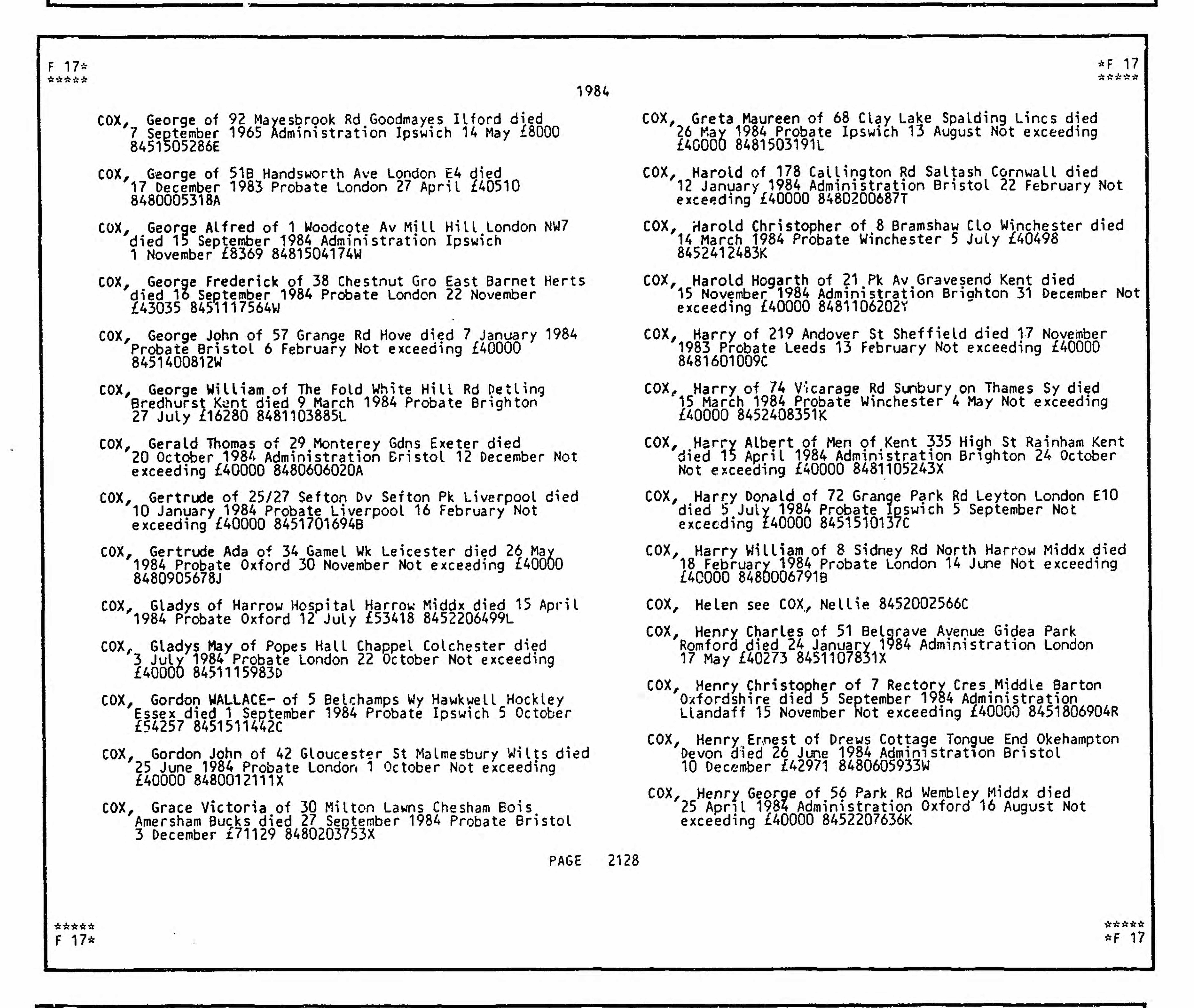 Death and probate of Gordon Wallace Cox; Ipswich; 5 Oct 1984
