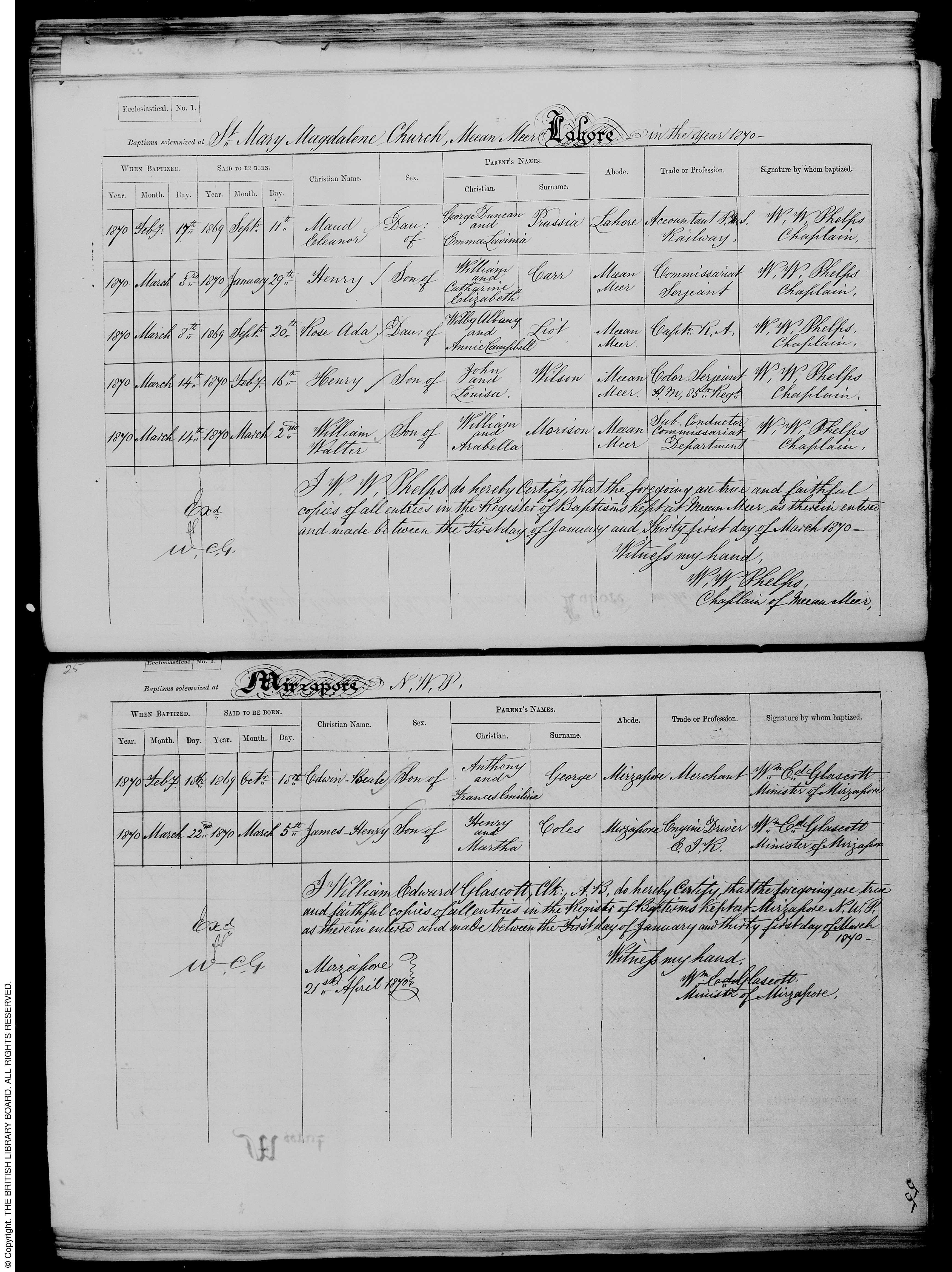 Birth and baptism of Maud Eleanor Prussia; Baptism 17 Feb 1870, Lahore; Father - George Duncan Prussia; Mother - Emma Lavinia; Archive N-1-131 Folio 55
