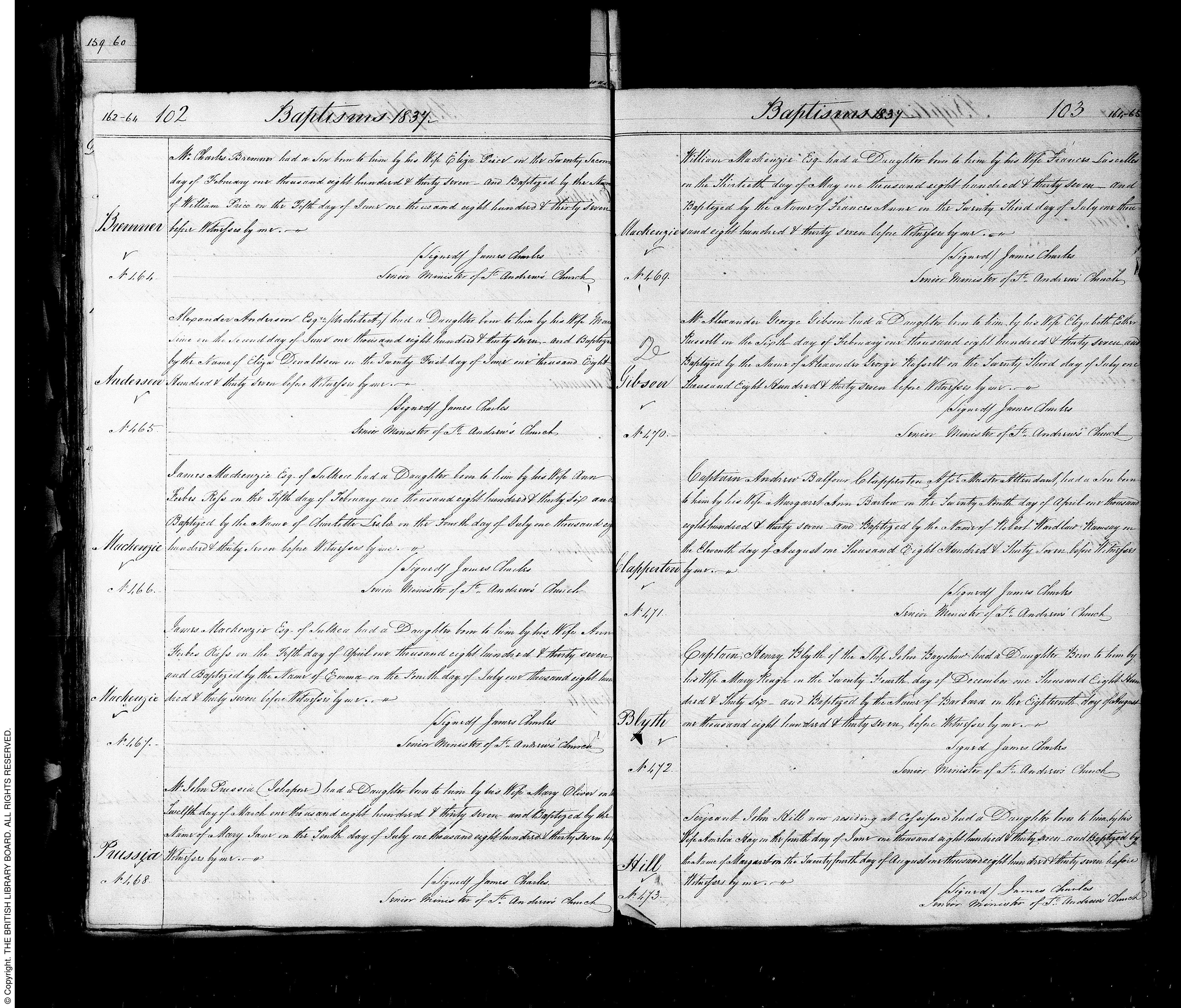 Birth and baptism of Mary Jane Prussia; baptism 10 July 1837, St. Andrew's,Calcutta; Father - John Prussia; Mother - Mary Oliver; Archive N-1-59 Folio 102 Entry 468