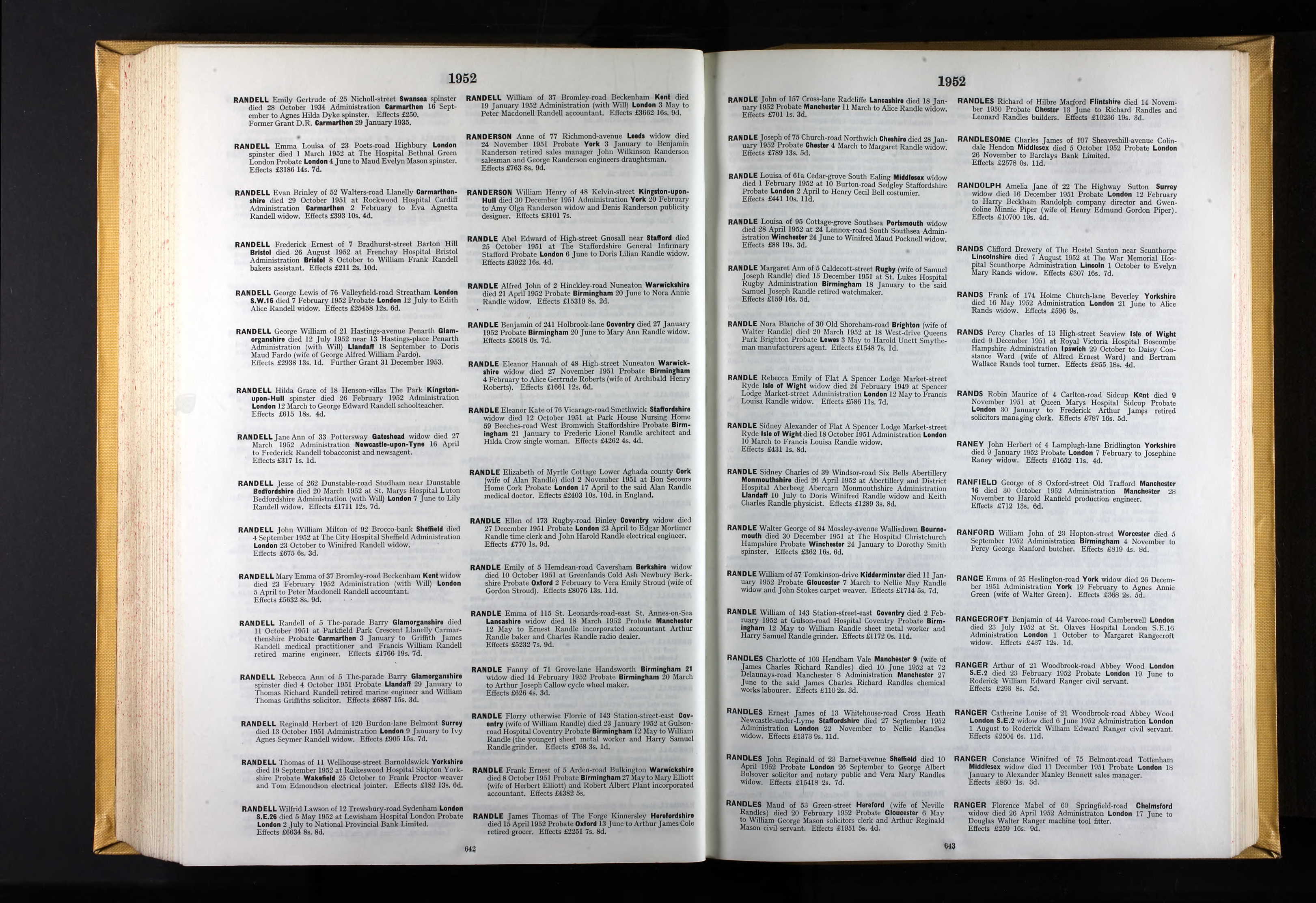 Death and probate for Wilfrid Lawson Randell; Probate London 2 July 1952