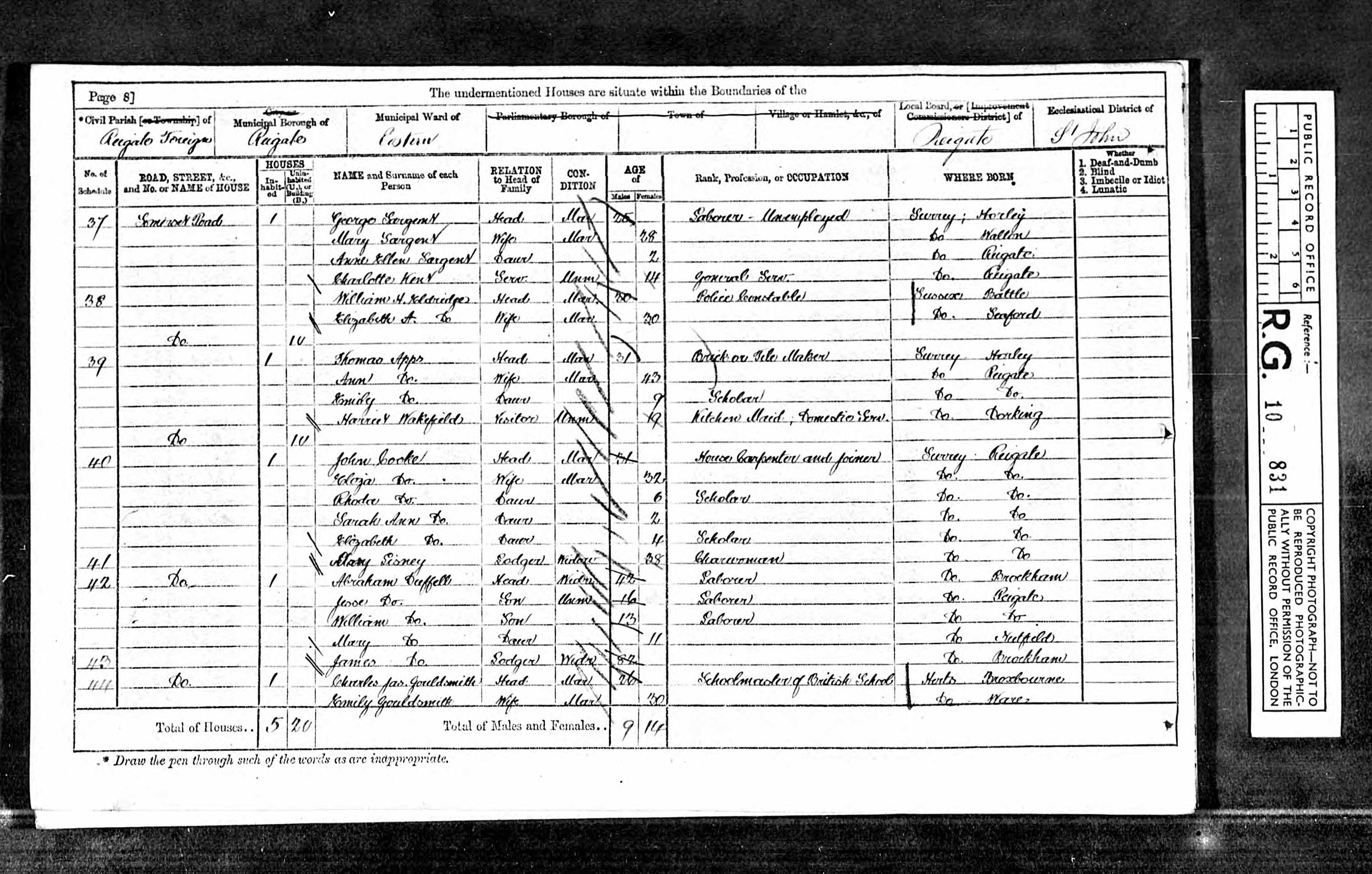Charles James Gouldsmith (Schoolmaster of British School), with wife Emily and daughter Emily Louisa; Reigate, Surrey; Class: RG10; Piece: 831; Folio: 56; Page: 8; GSU roll: 838705.