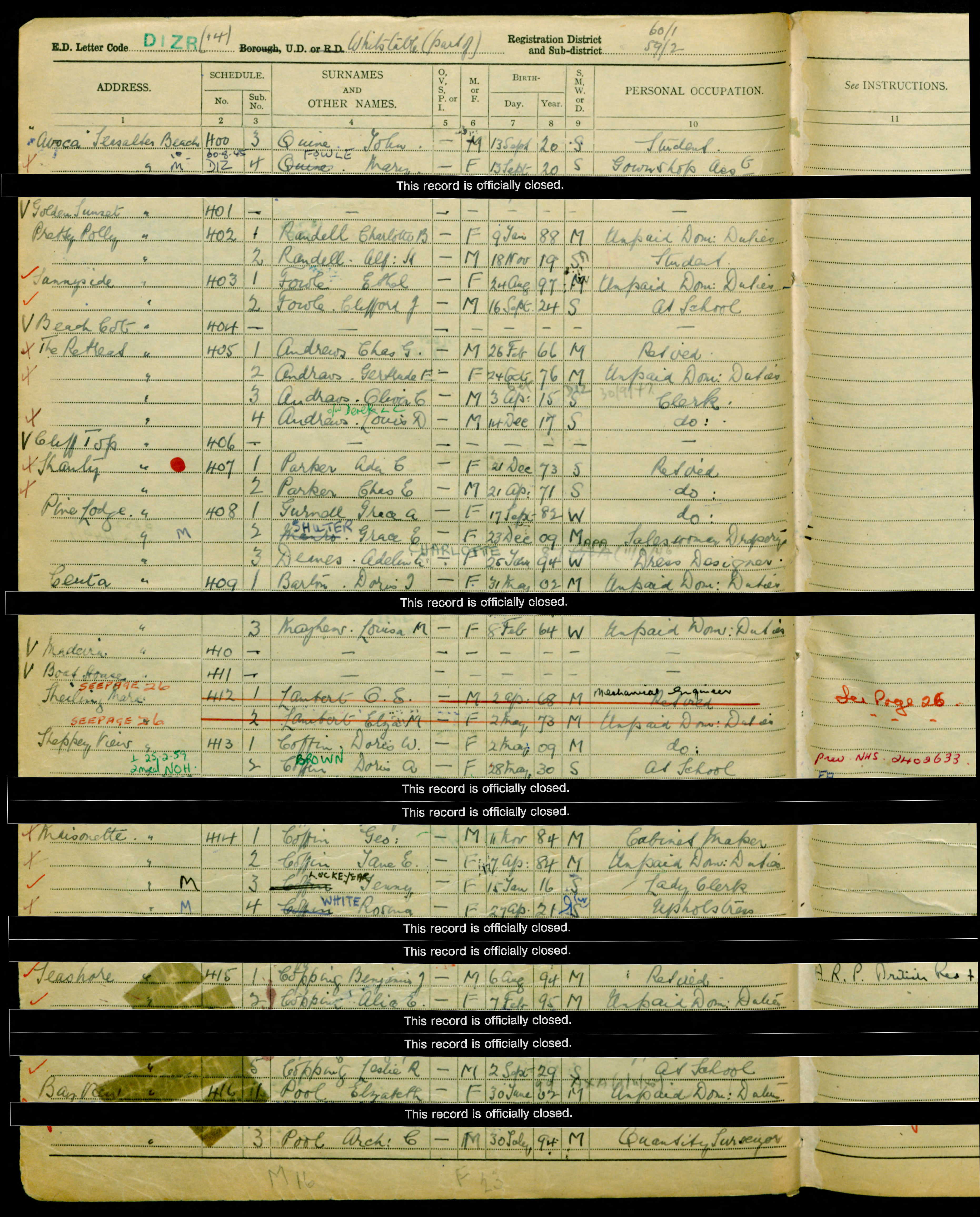 1939 Register - Charlotte Beatrice Life and Alfred Hollis Randell: Whitstable; Line 5, Schedule 402/1; ED DIZR; Reg district 60/1 59/2