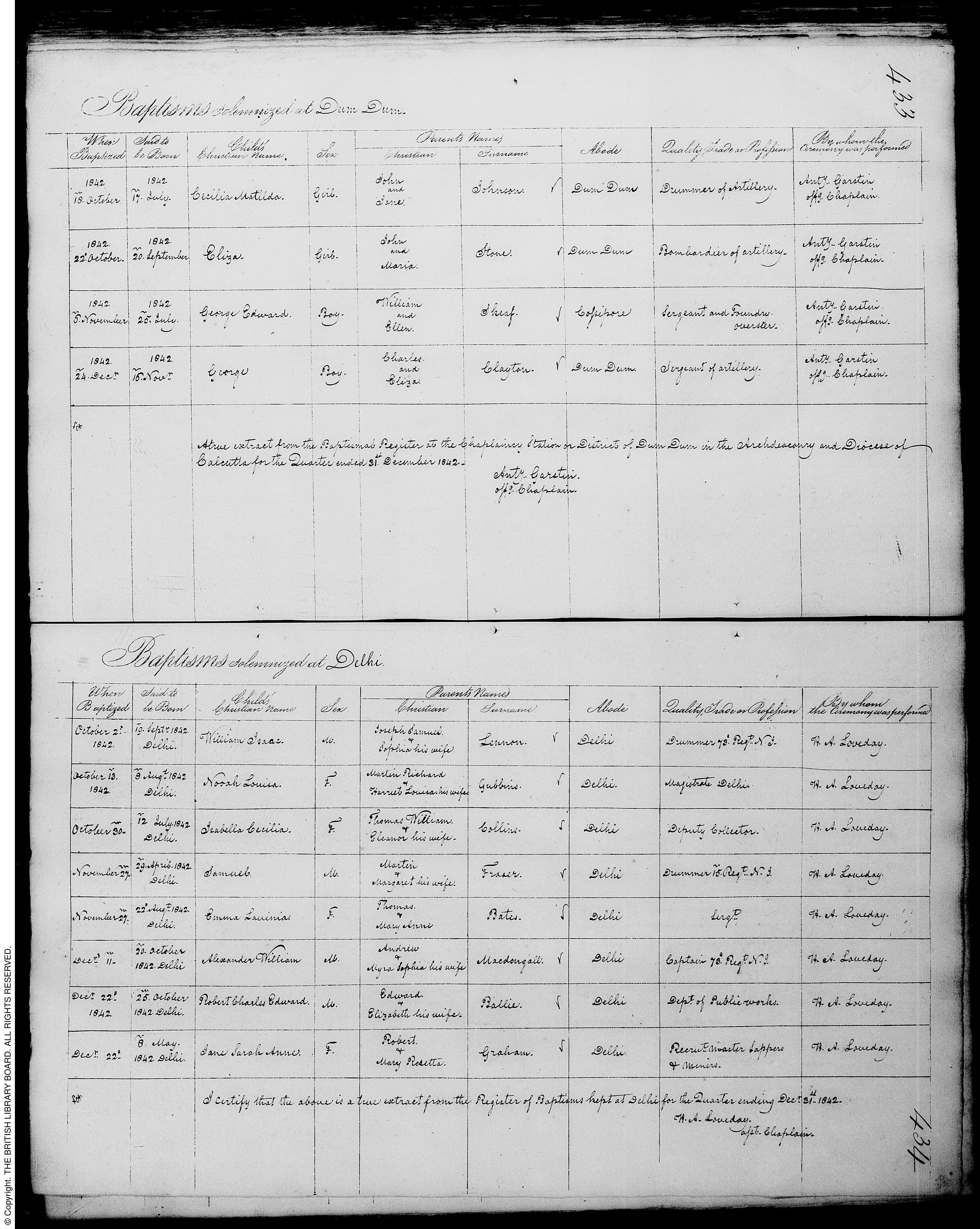Birth and baptism of Emma Lavina Bates; Baptism 27 Nov 1842, Delhi; Father - Thomas Bates; Mother - Mary Anne; Archive N-1-63, Folio 434