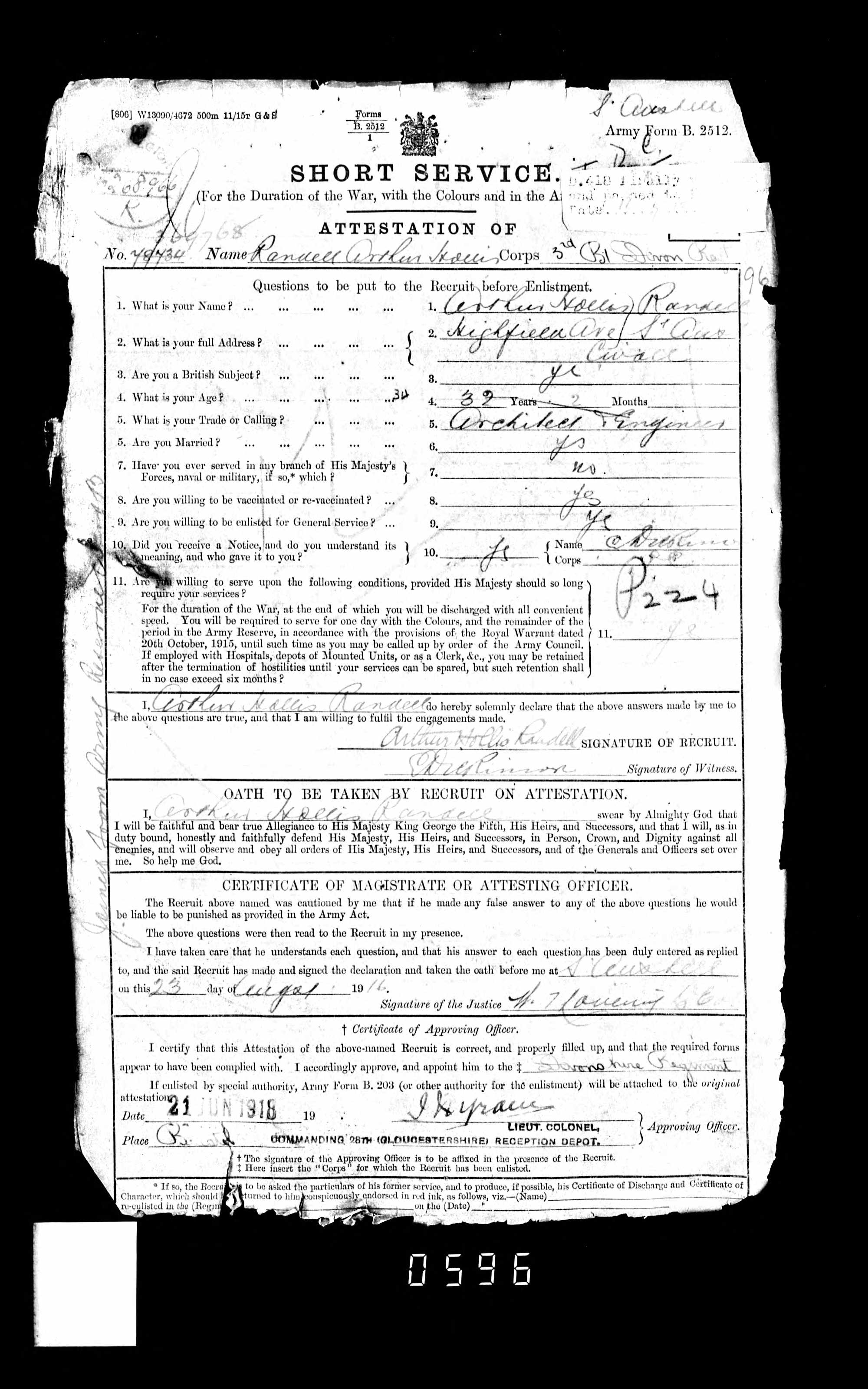 Arthur Hollis Randell - Short Service Attestation, Devonshire Regiment; Marriage 1 Apr 1914; Reg Number 369768