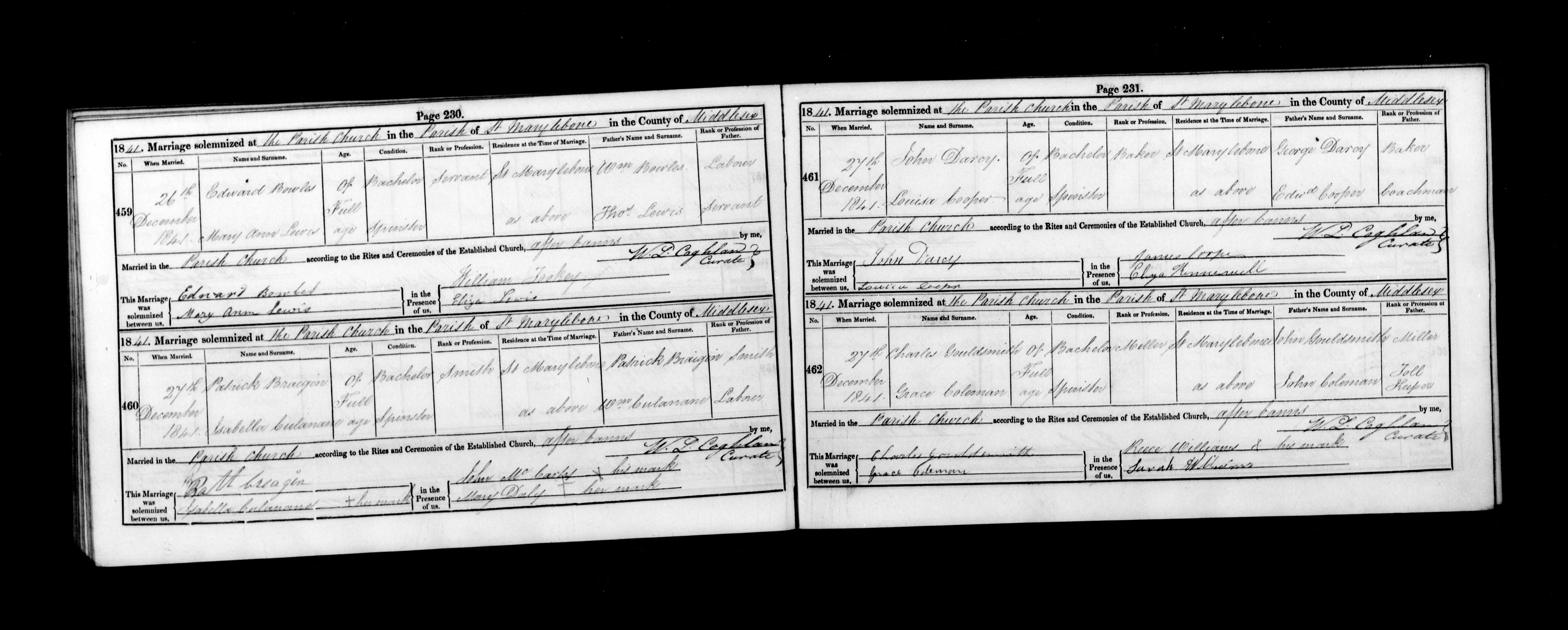 Marriage of Charles Gouldsmith and Grace Coleman; St Marylebone, Westminster; Father John Gouldsmith, spouse Grace Coleman