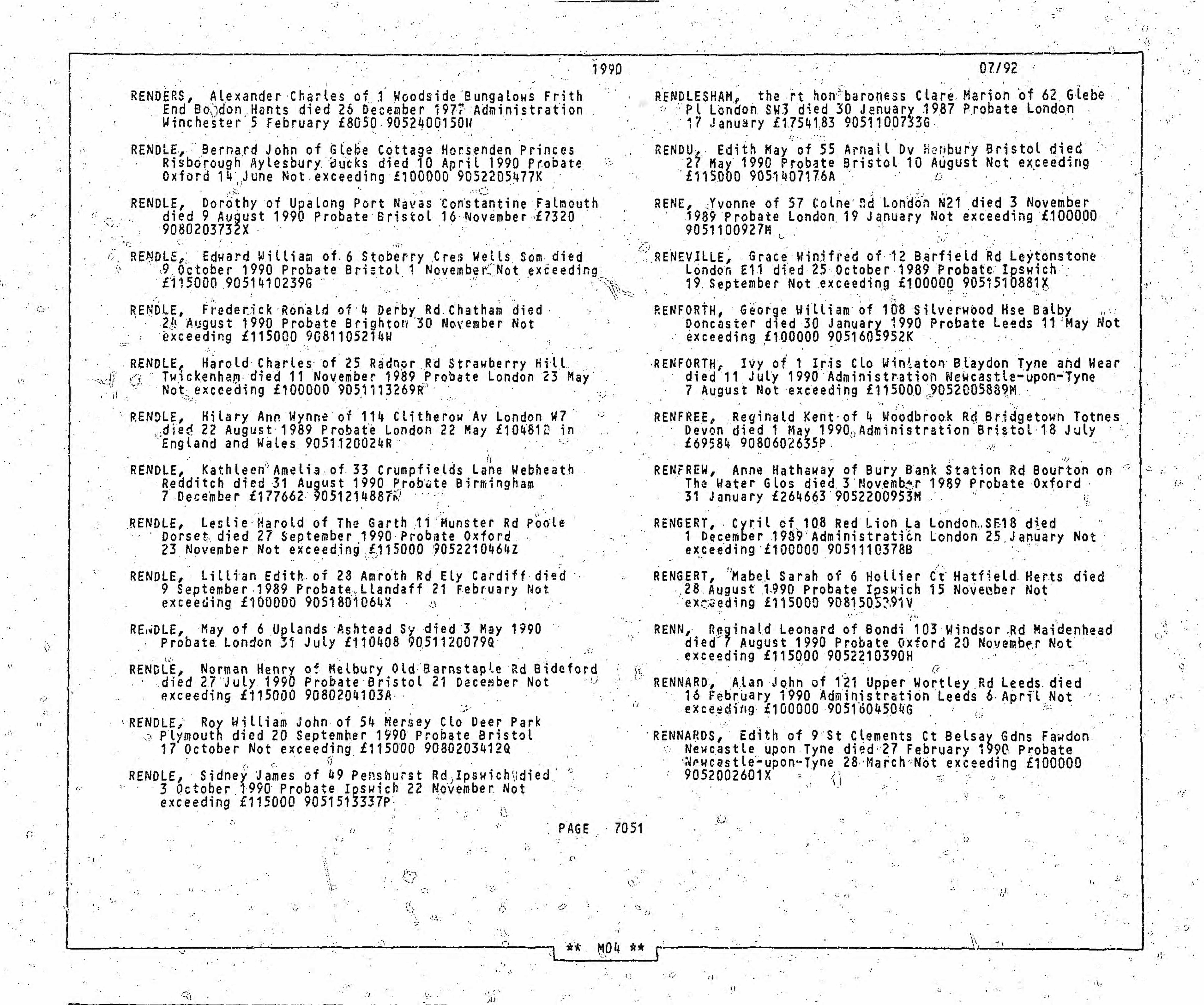 Death of Clare McCririck, Rt Hon Baroness Clare Marion Rendlesham; probate London, 17 January 1990