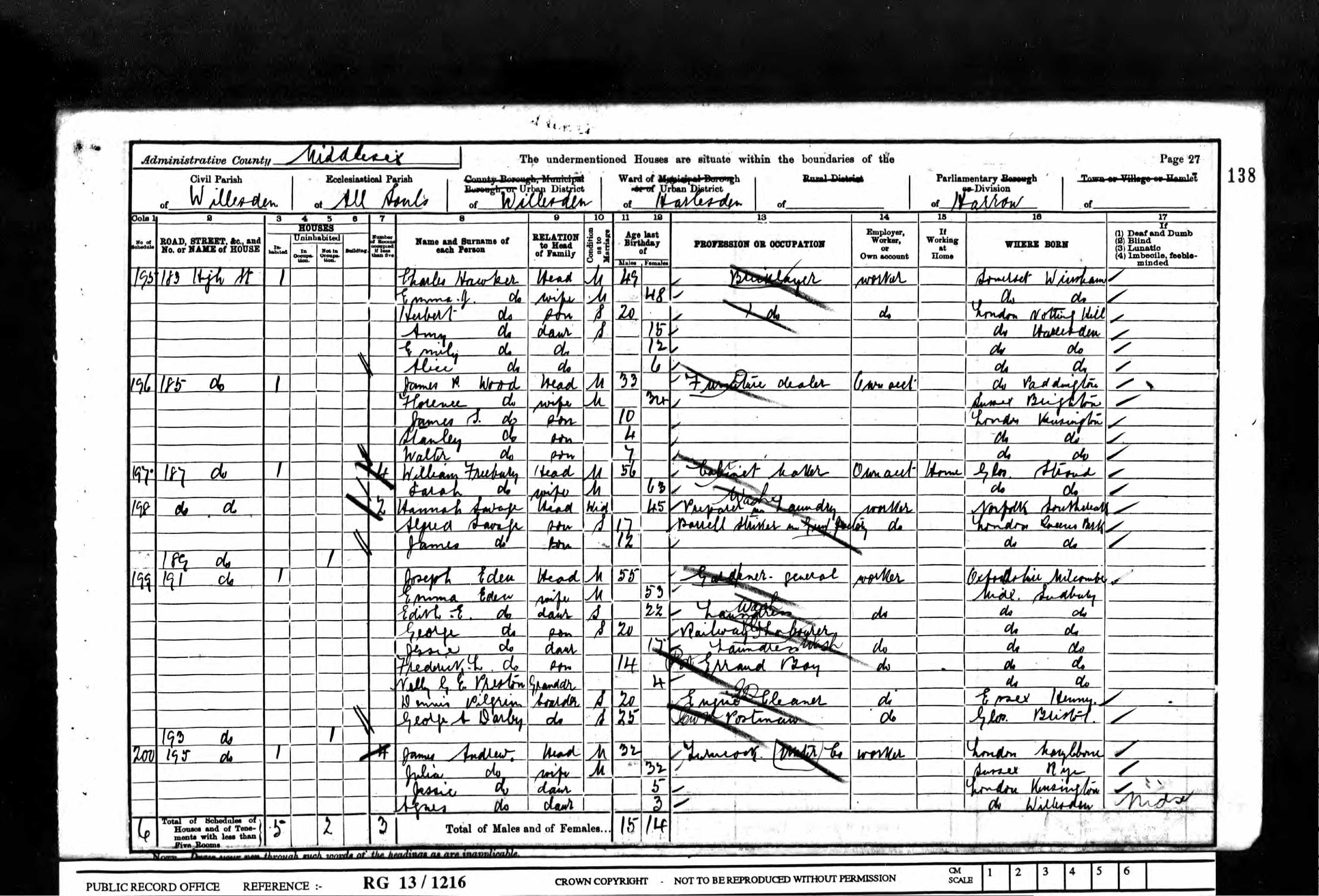 1901 Census - William Henry Freebury and wife Sarah Anne: Class: Hendon, Willesdon; RG13; Piece: 1216; Folio: 138; Page: 27.