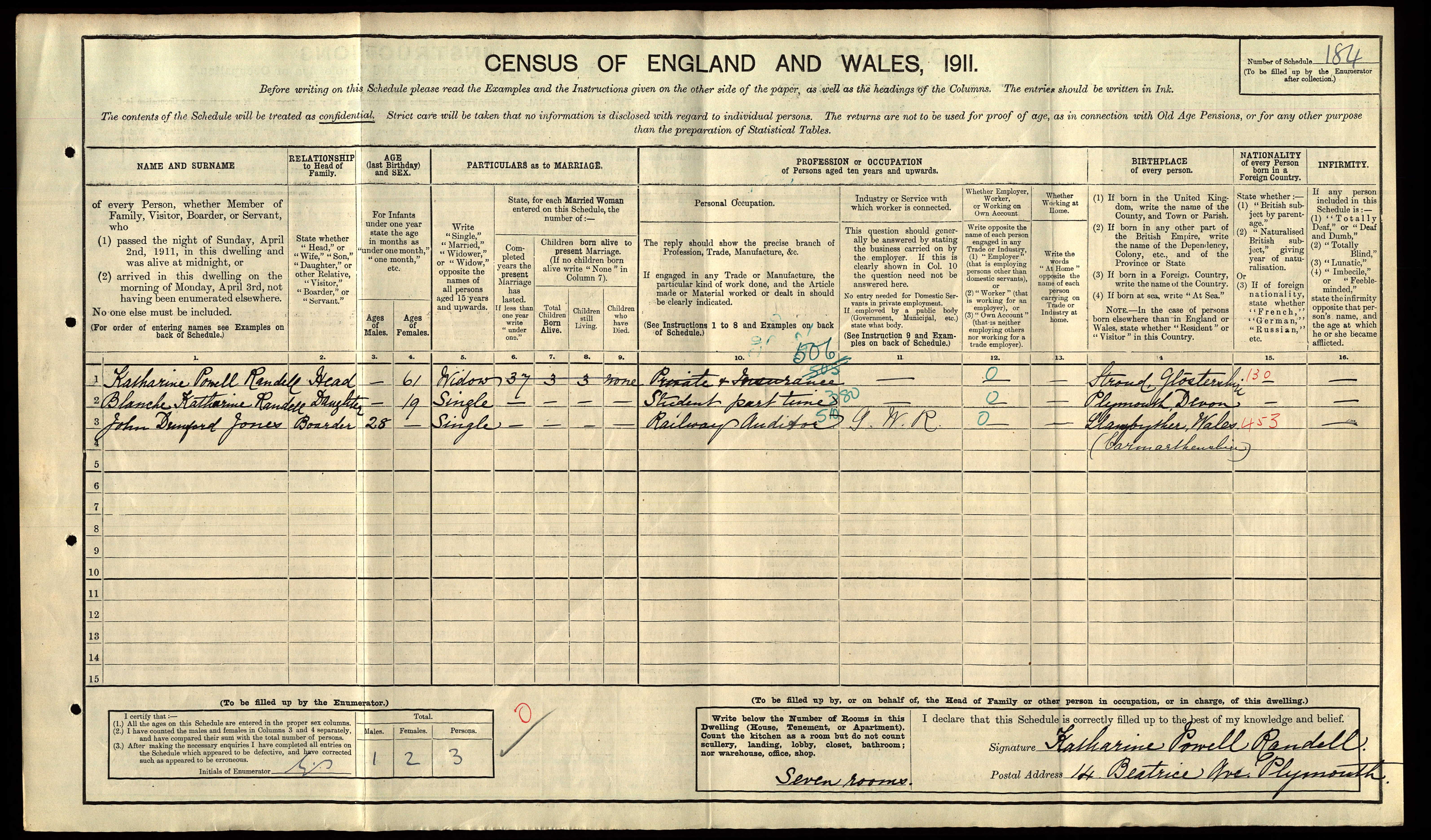 1911 Census - Katherine Powell Dudbridge, daughter Blanche Randell and a boarder; Plymouth; Class: RG14; Piece: 12968; Schedule Number: 184
