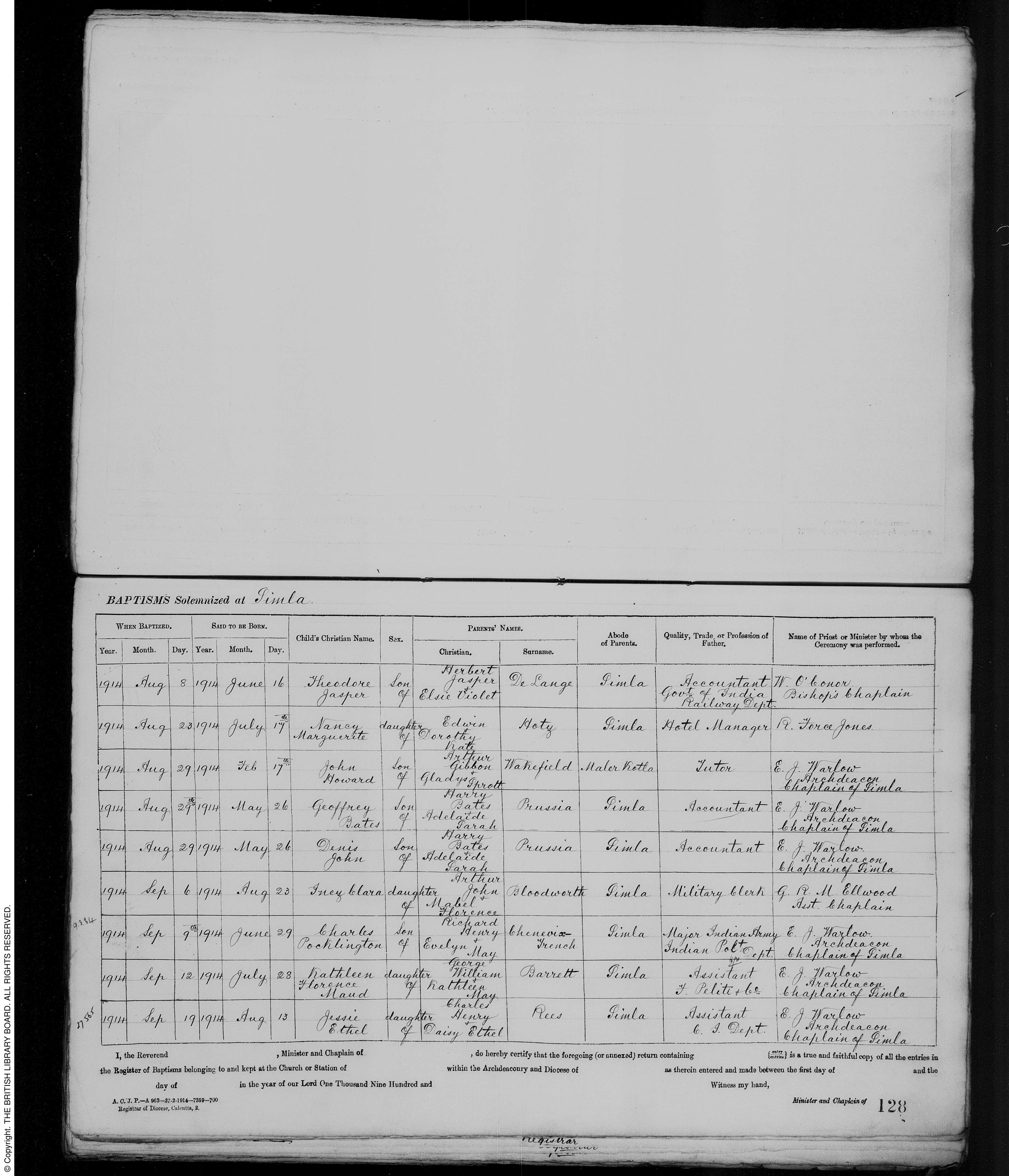 Birth and baptism of Geoffrey Bates Prussia; Baptism 29 Aug 1914, Simla; Father - Harry Bates Prussia; Mother - Emma Lavinia; Archive N-1-398 Folio 128