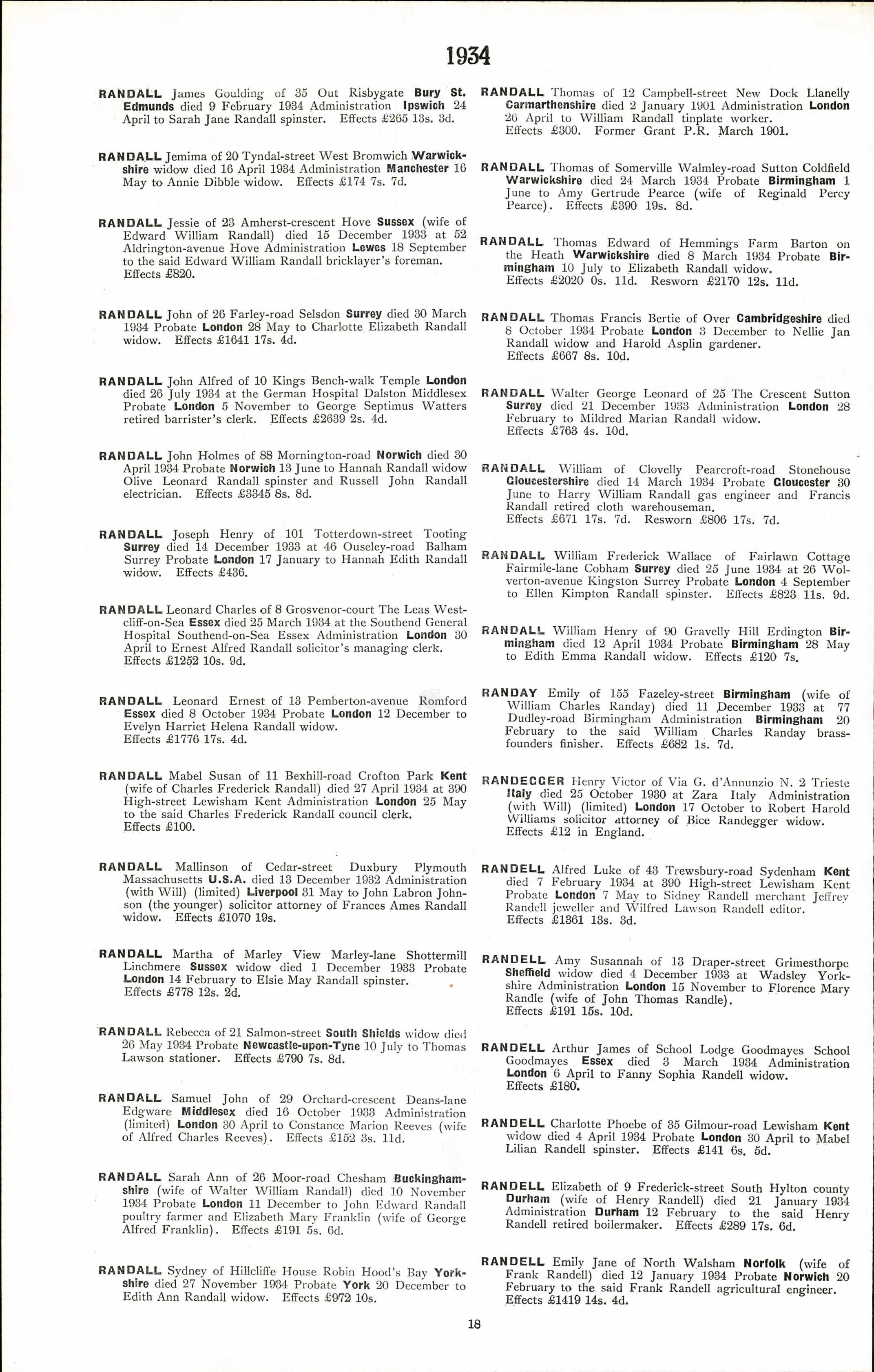 Death and probate for Alfred Luke Randell: Probate London 7 May 1934