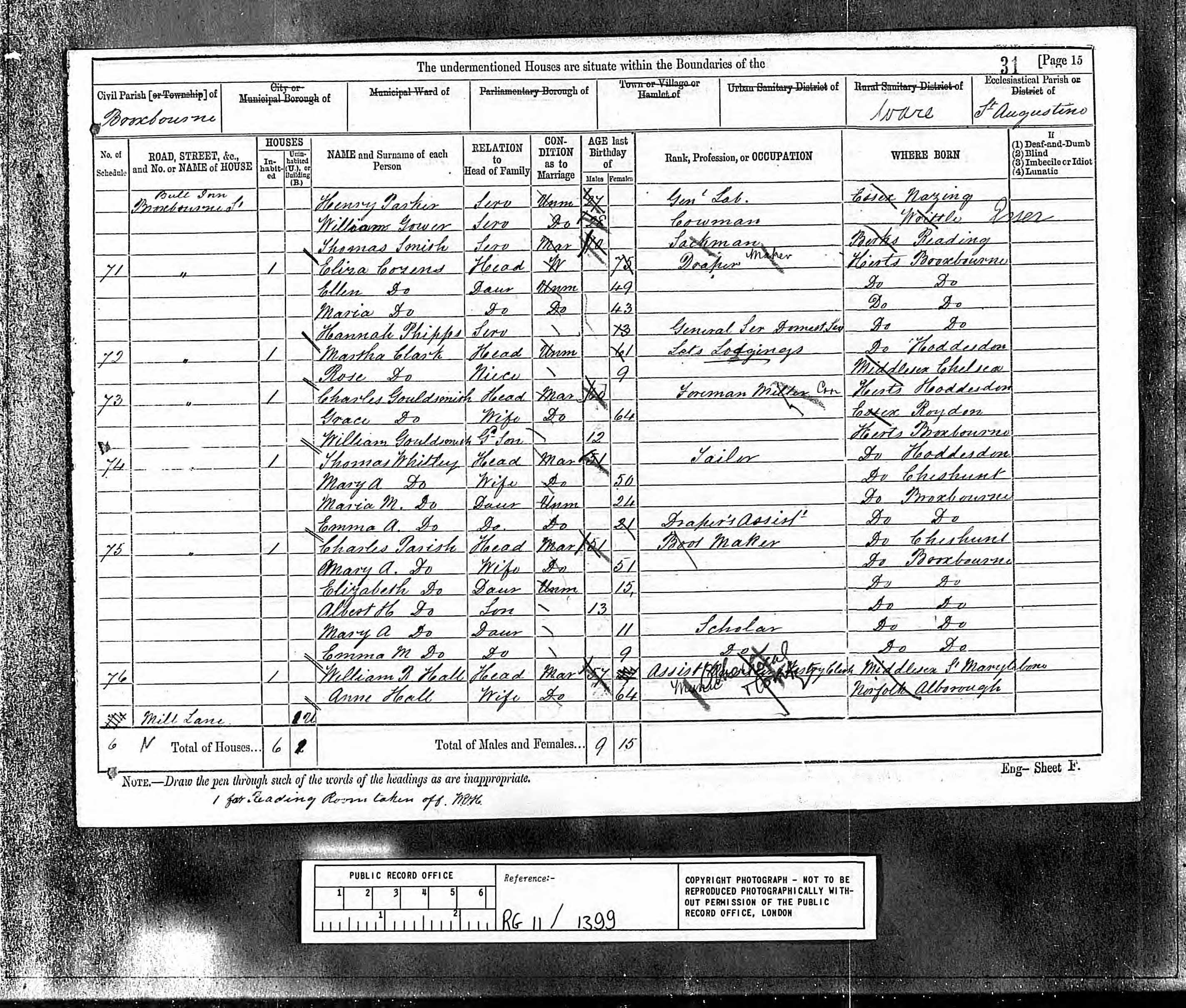 1881 Census - Charles Gouldsmith (Foreman Miller Corn), wife Grace and grandson William; Ware; ED 2, Piece 1399, Folio 31, Page 15