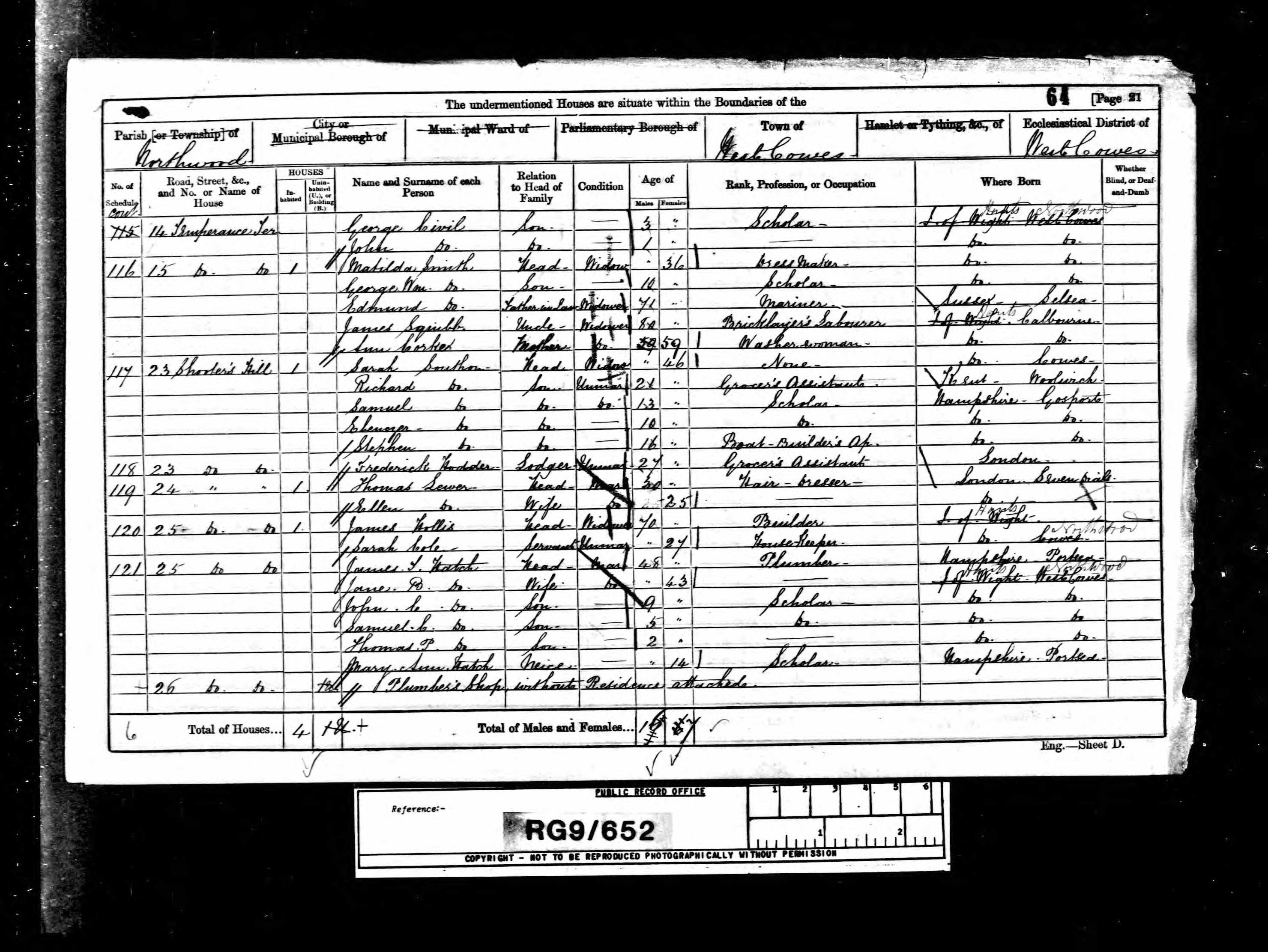 1861 Census - James Hollis; daughter Jane with her family; Northwood; Class: RG9; Piece: 652; Folio: 64; Page: 21; GSU roll: 542678.